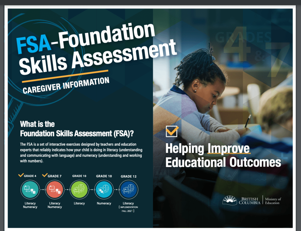 From October 4 to November 12, 2021, our students in grade 4 and grade 7 will be participating in the Foundation Skills Assessment Test, also known as the “FSA”. This is a provincially mandated standardized test that uses broad metrics to determine whether students are meeting curricular expectations at grade level in literacy and numeracy.