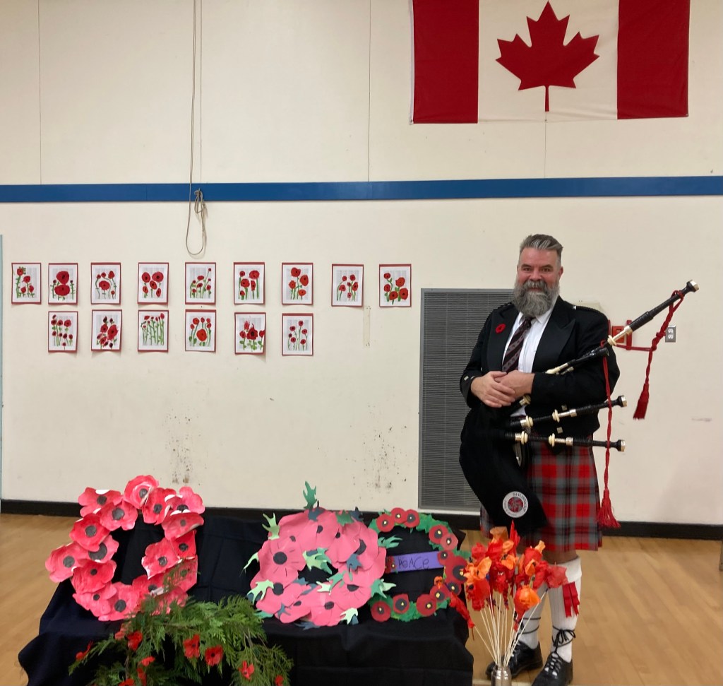 Our Remembrance Day assembly brought staff, students and guests together to share in reflections, poems, music and art. Classes did an incredible job of contributing to the assembly and our audience was both respectful and reverent. We want to extend our gratitude to Greg Davidson of Shuswap Pipes n’ Drums for attending our ceremony and playing the bag pipes.